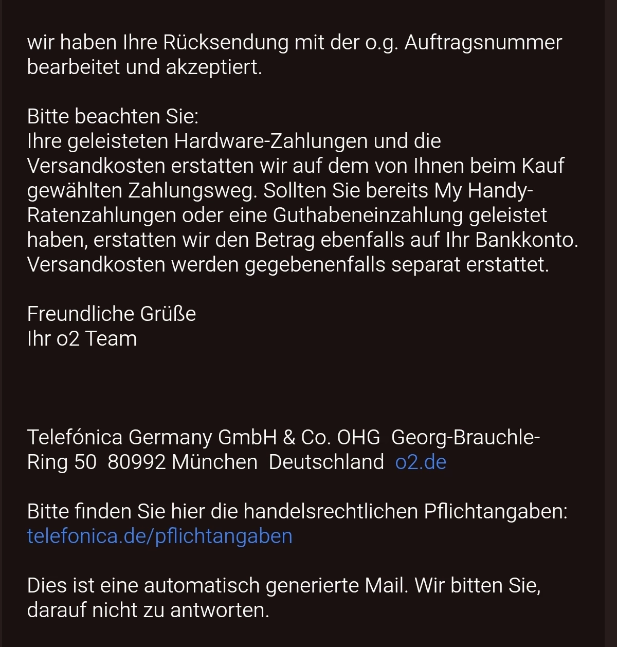 Diese E-Mail habe ich bekommen. Ist das ganze dann Rückabgewickelt worden. Schicken die jetzt ein Ersatz oder muss ich den Vertrag jetzt wiederufen und den Vertrag erneut verlängern? Habe noch 7 Tage Zeit den Tarif zu wiederufen. Habe ja im Retourenportal Ersatzlieferung angeklickt .