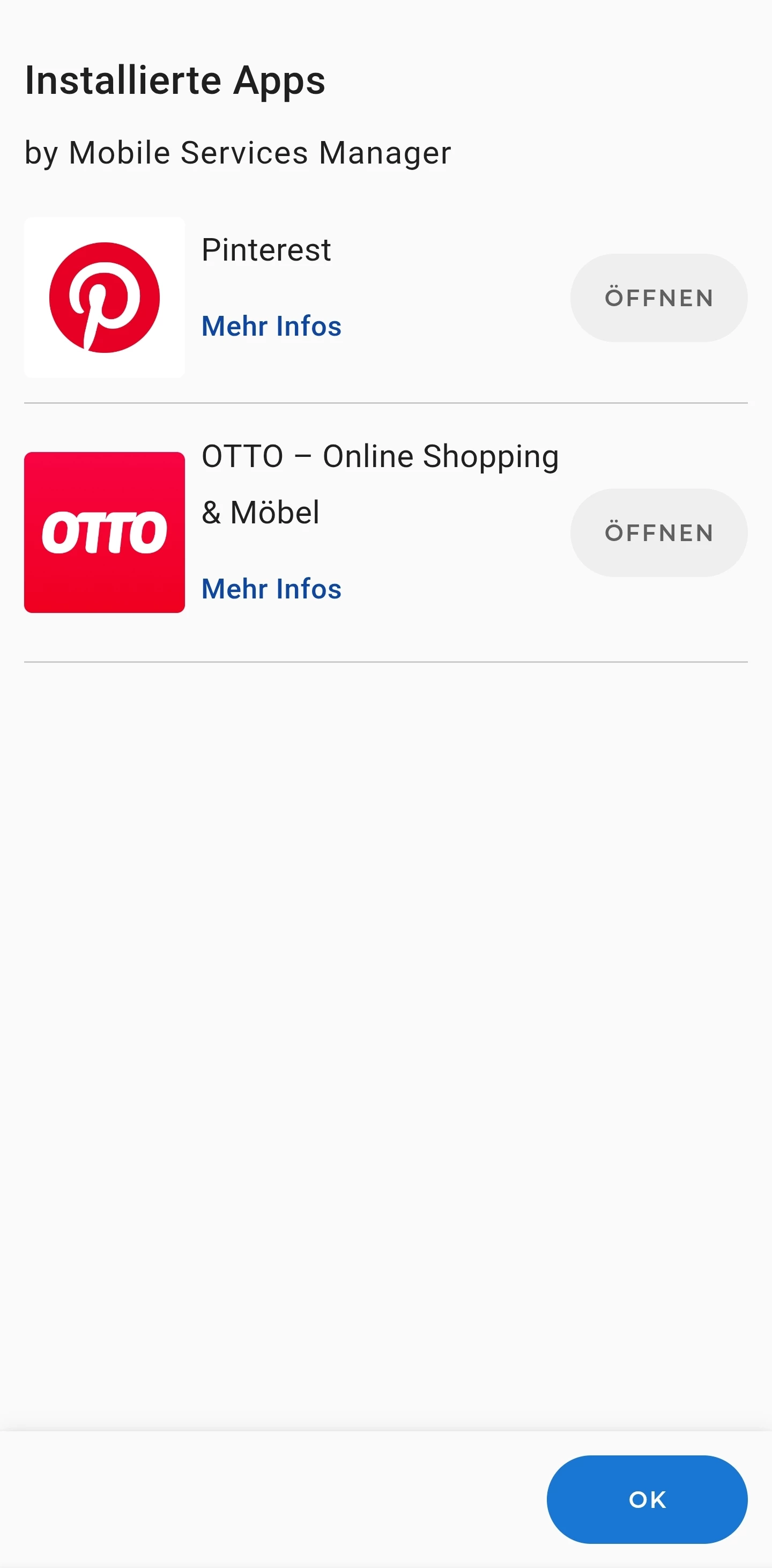 Es wurden hier also ungefragt einfach die Apps von Otto und Pinterest installiert. Wenn man nach Mobile Services Manager sucht, dann findet man Beiträge, dass diese App offenbar von o2 genutzt wird, um zusätzliche, promotete Apps zu verteilen. Aber dass diese nicht nur angeboten sondern einfach installiert werden, und dann noch auf einem Gerät, dass wir für mehr als 1200 € gekauft haben, ist ein absolutes No-Go.