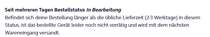 Aus wenn ich dir sicher jetzt nichts neues erzähle, ist dort eine Bestellung seit meheren Tagen unverändert im Status “In Bearbeitung” besteht leider doch noch keine Verfügbarkeit und es muss der nächste Wareneingang abgewartet werden, erst im Anschluss ändert sich der Status erneut.