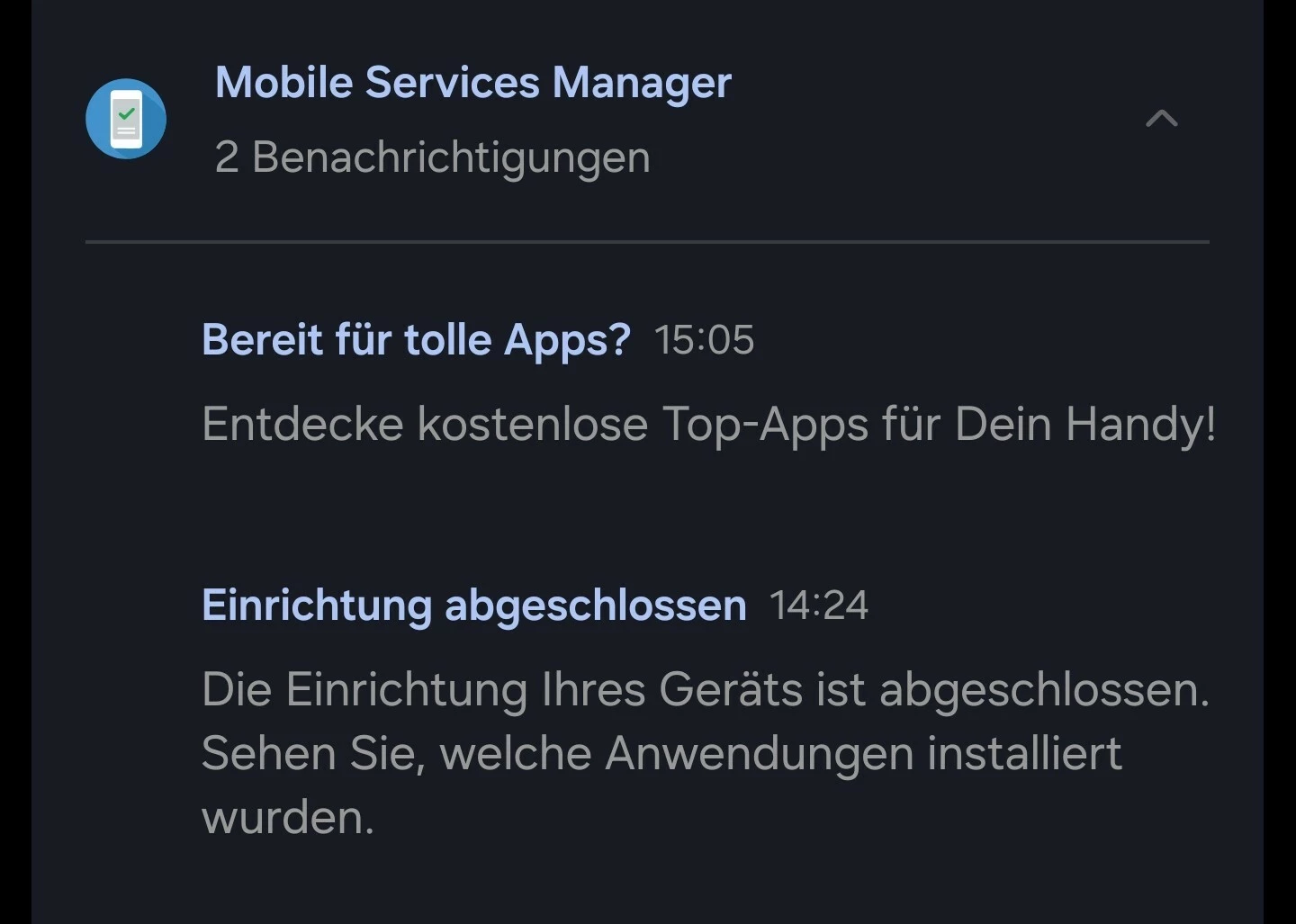 3. Und dies war letztlich der ausschlaggebende Grund: Meine Partnerin wurde gestern von Benachrichtigungen einer “Mobile Services Manager” App auf dem o2 Gerät begrüßt, die wir nicht installiert haben und die auf den EUX Geräten nicht vorhanden ist, dass Anwendungen installiert wurden: