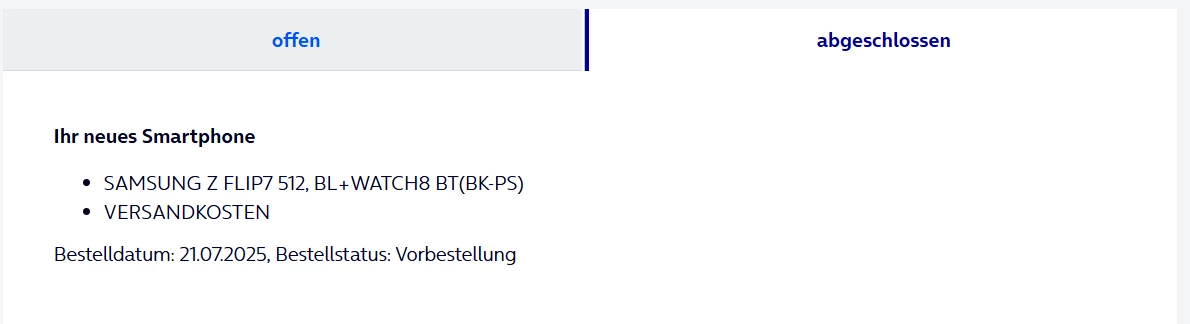 Hallo, ich habe das Samsung Flip mit der Galaxy watch 8 am 20.07. bestellt von der Aktion. Seit einer Woche ist der Status auf in Bearbeitung.