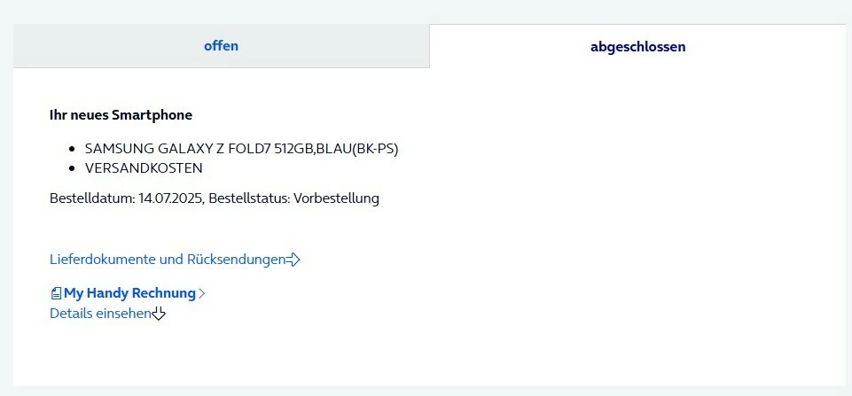 Bei mir steht jetzt in der mein O2 App Hardware wurde versandt und online steht der Status auf in Bearbeitung. Habe das z fold 7 mit der watch ultra am 11.07. als Vertragsverlängerung bestellt. Ist schon interessant:D