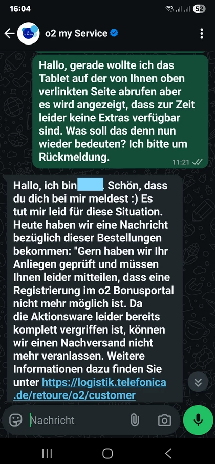 O2_Solveig antwortete mir, er sieht es auch so, das ich in der Aktion bin, aber kurz darauf waren dann die Bestände leer…