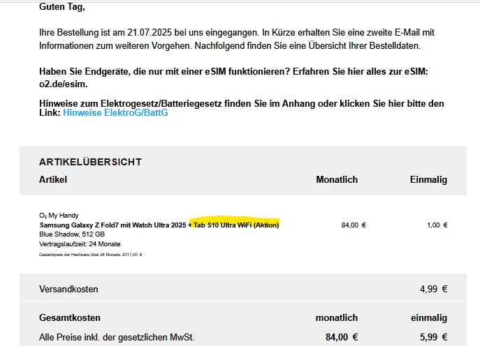 Zudem habe ich mir auch die Bestellbestätigung angeschaut da steht nirgends eine Klausel im Gegenteil: Samsung Galaxy Z Flip7 mit Watch8 BT + Tab S10+ WiFi (Aktion)