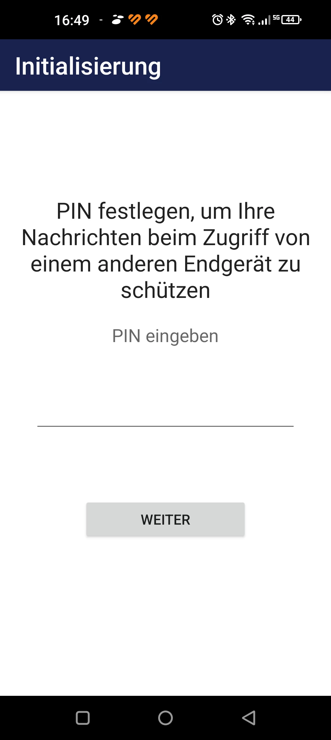 Wenn ich die App nach der Installation das erste Mal starte, muss ich erst einmal die Freigaben starten (Kontakt, Standort, Kamera  usw). Dann erscheint die Initialisierung s Meldung mit der Frage nach dem Pin. Das erste Fenster wie bei dir wird mir nicht angezeigt.