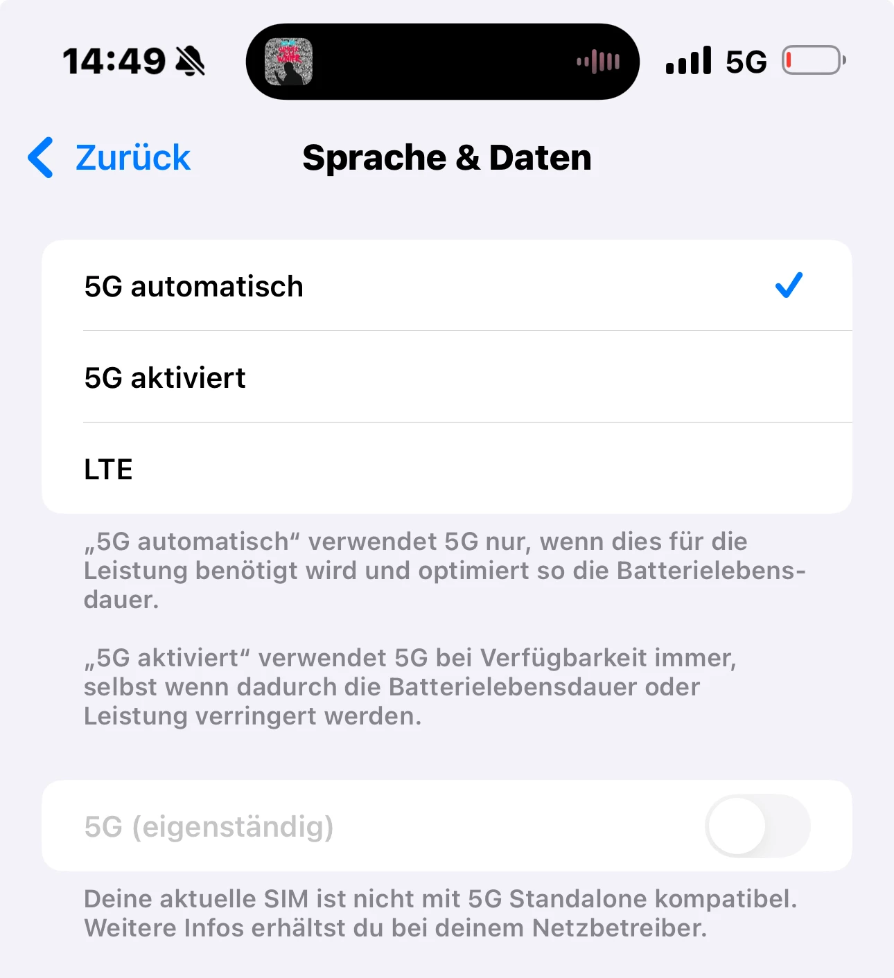 Allerdings hab ich mal eine Frage! Da ich ja jetzt das 5G Plus Netz nutze wird beim iPhone dann auch das 5G+ Symbol angezeigt? Weil momentan wird nur das normale 5G Symbol angezeigt! Kann man da vielleicht ein Update oder so rausbringen das bei non SA nur das normale 5G steht und sobald man 5G SA nutzt das mein iPhone dann auch 5G+ anzeigt?