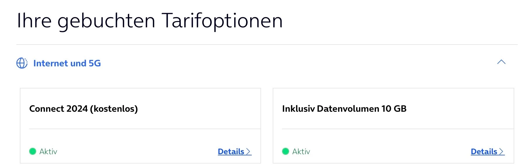 Einsehen kannst du dies im Kundenportal oder in der App. Schau dort unter „Tarif & SIM-Karte“ und dann bei „Ihre gebuchten Optionen“. Dort sollte die Connect-Option ersichtlich sein, sofern sie in deinem Tarif inklusive ist 🙂