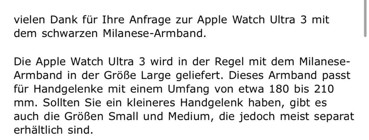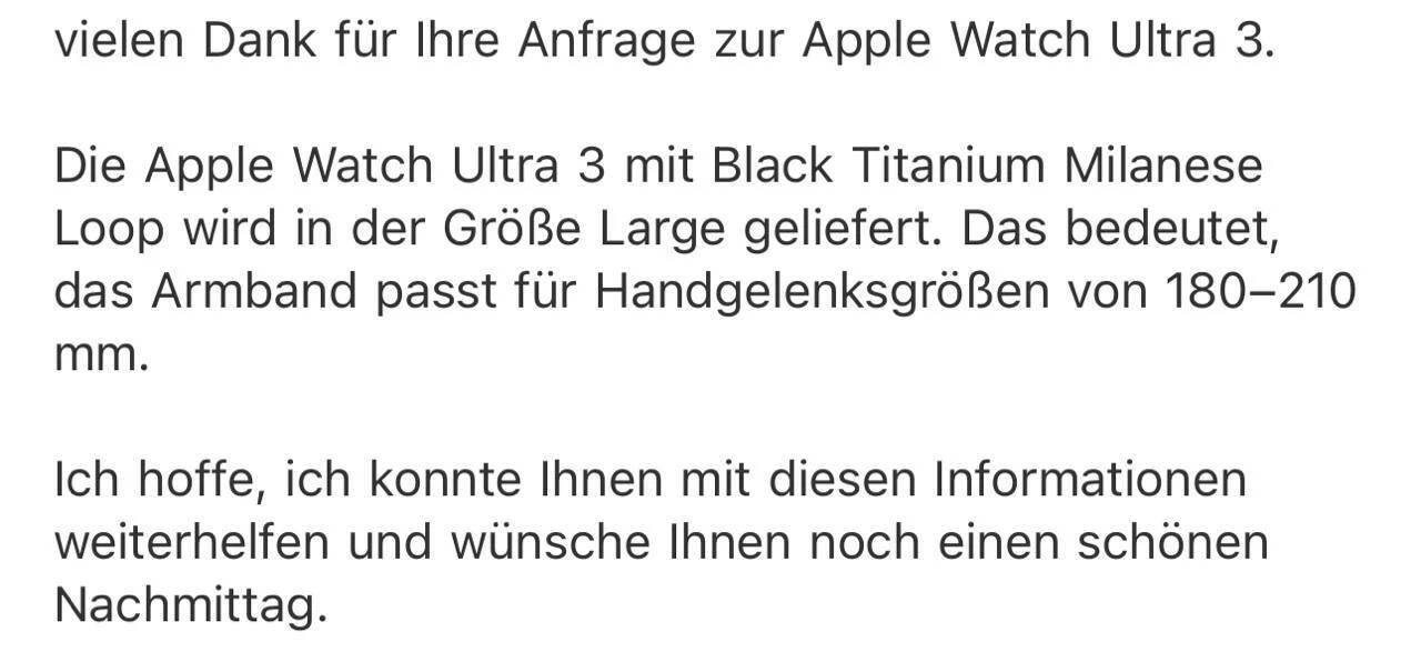 Weiß jemand, welche Armbandgröße bei der Bestellung einer Apple Watch Ultra 3 in Schwarz - Milanese geliefert wird?