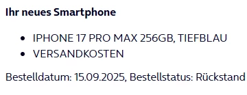 ich habe am 12.09.2025 das iPhone 17 Pro Max 256 GB in Silber vorbestellt. Seitdem hat sich am Auftragsstatus jedoch nichts geändert – dort steht nach wie vor nur “Vorbestellung”.