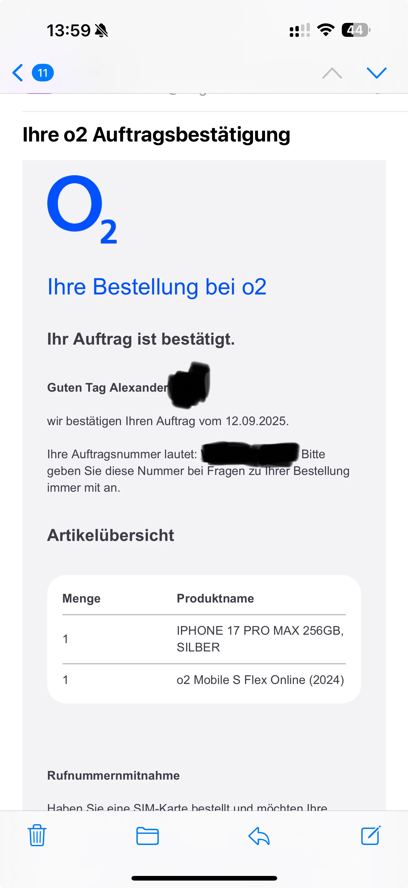 So habe um 13:40  ein iPhone 17 Pro Max 256 GB in Blau bestellt mit Vertragsverlängerung,