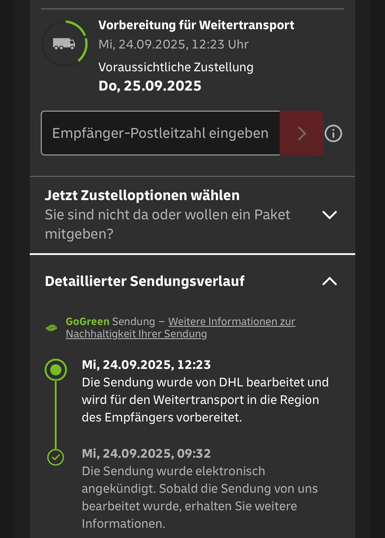 Hab gerade die interne Liefernummer bei DHL eingegeben und siehe da noch zwei Stopps dann ist es da🙏