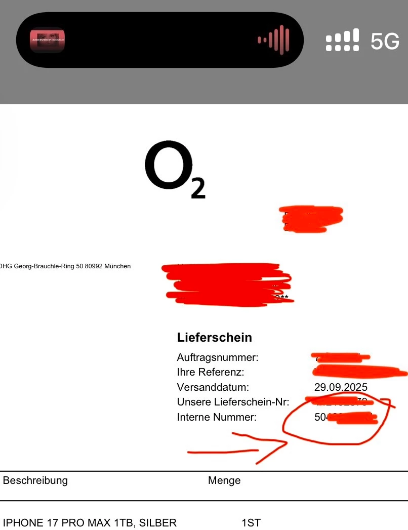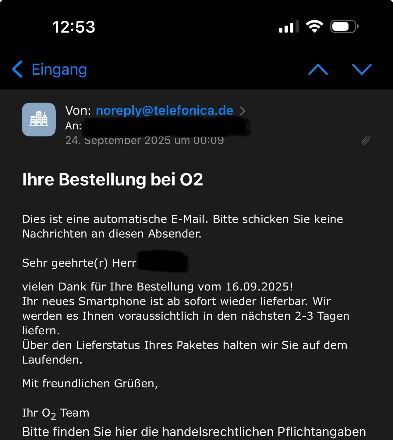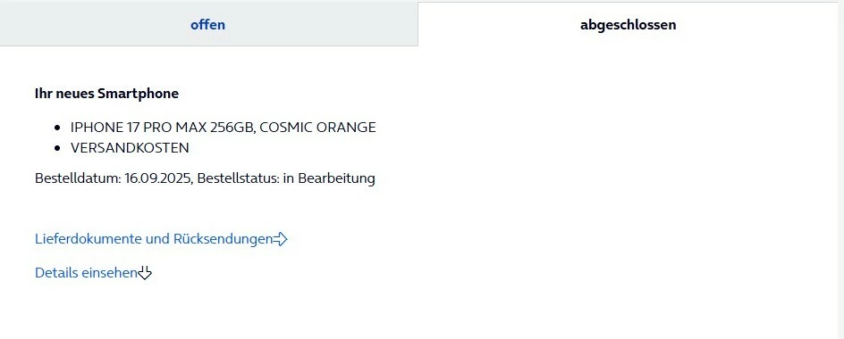 Und zwar habe ich am 16.09. das iPhone 17 Pro Max (Cosmic Orange 256GB) bestellt.