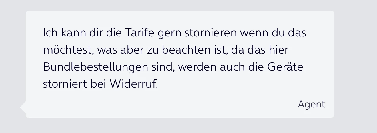 @CodeSight ja, so ungefähr habe ich es im Chat eingeleitet. Dann das obligatorische „Vorgesetzen fragen“, danach das obligatorische „ich darfs ausnahmsweise machen nur den Tarif zu stornieren“.