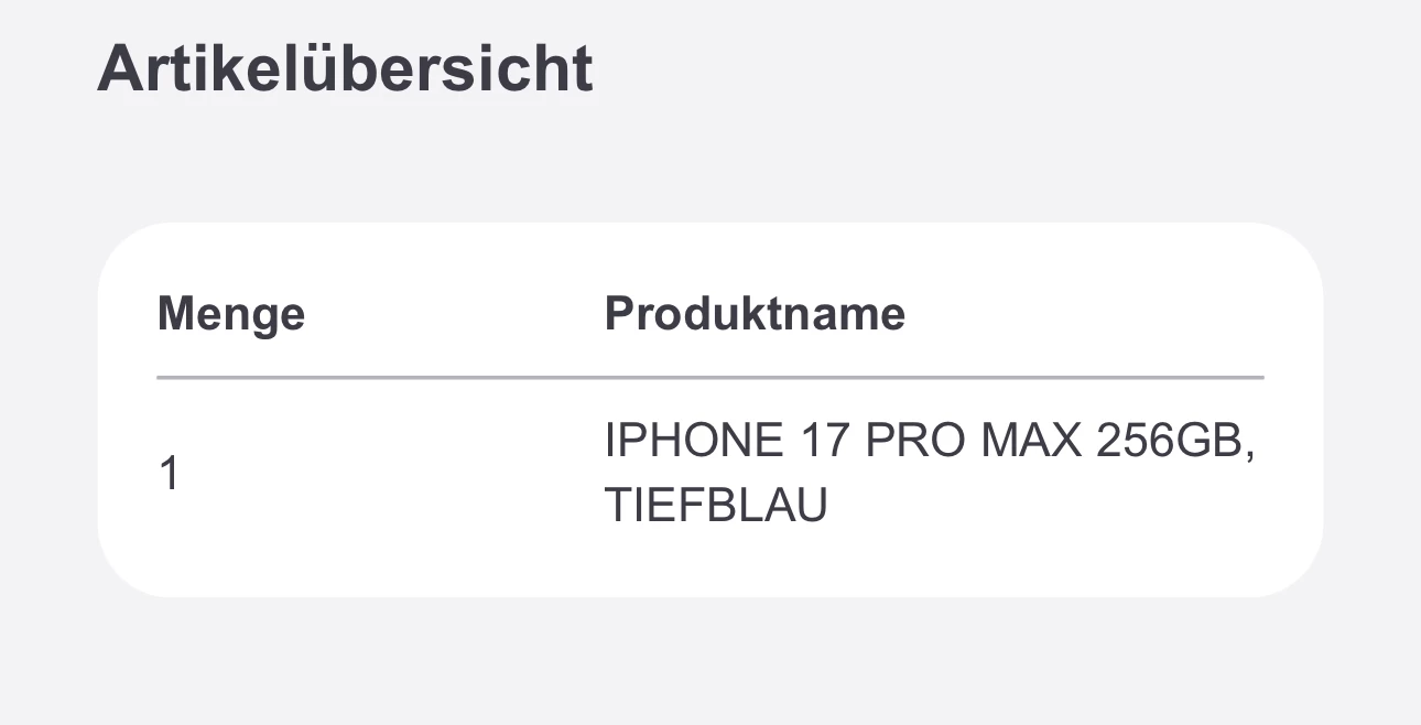 Ich habe um 14:30 telefonisch mit einer VVL das IPhone 17 Pro Max bestellt und eine AB direkt erhalten. In meinen Bestellungen  finde ich auch schon die Hardware Bestellung. Alles gut gelaufen 👍🏽