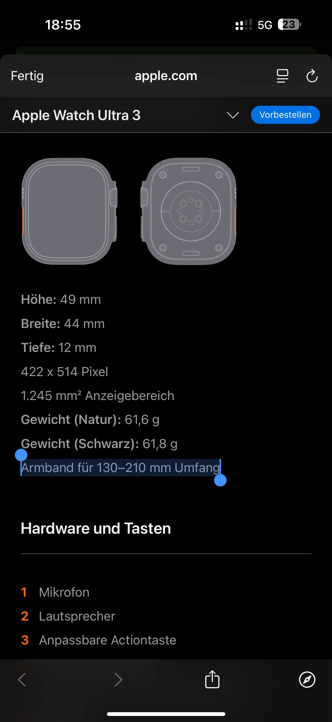 Hallo, ich weis das ich hier vermutlich falsch bin, kann mir aber einer sagen welche Länge das Armband bei der Apple Watch Ultra 3 Titanarmband hat? Ich kann dazu nichts finden und die Hotline kann es mir auch nicht sagen xD