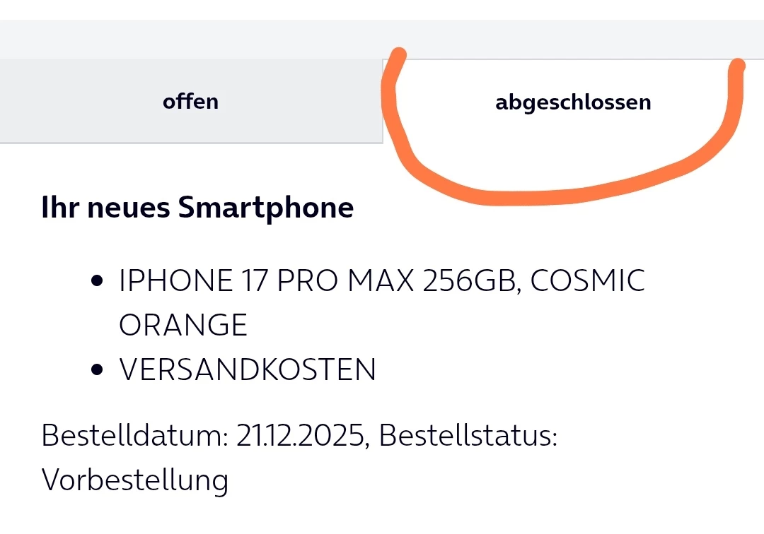 Ich habe am 21.12. eine Bestellung für ein iPhone 17 Pro Max sowie eine SIM-Karte aufgegeben.