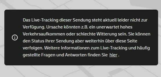 Heute Morgen 6 Zustellstopps entfernt und nun geht schon länger die Liveverfolgung nicht mehr-egal welcher Browser oder APP, wie ich bereits schrieb bei uns werden sehr oft Pakete ins Fahrzeug geladen und dann wird die Tour abgebrochen, vermutlich wird es auch heute wieder so sein, halt DHL😁 Aber egal, sollte es so sein ist Morgen auch noch ein Tag.Achja Wetter ist gut und Verkehr nichts los.😁