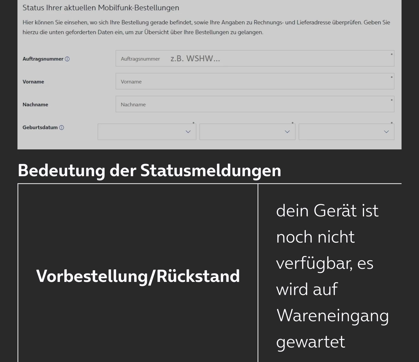 hier in unserem Artikel zu my Handy-Bestellungen haben wir die jeweiligen Bestellstatus aufgelistet, bei Vorbestellung wie bei Rückstand sind die Geräte noch nicht bei unserer Logistik zum Versand bereit.