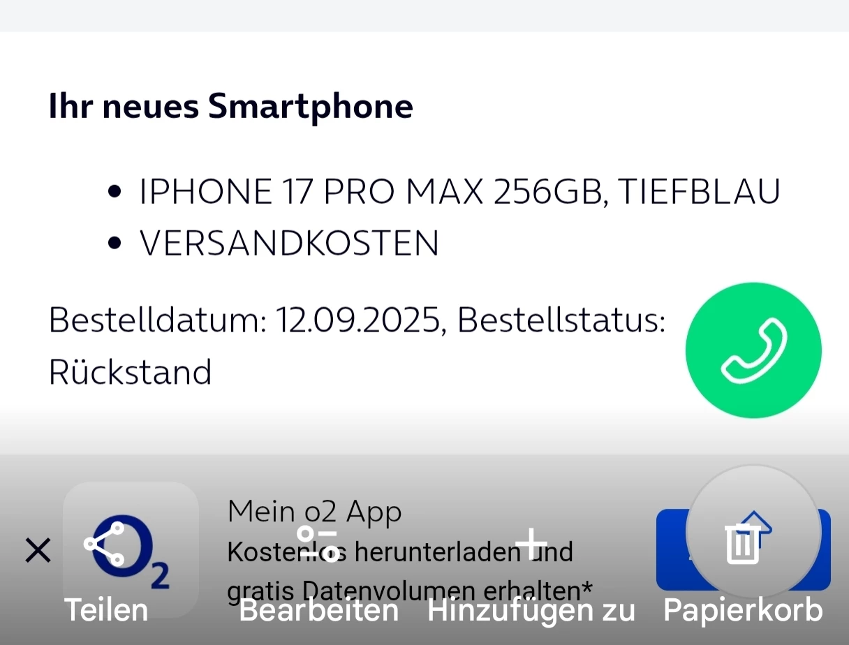 Nachfrage an O2-Team, ich habe mein iPhone in der ersten Stunde der Vorbestellung bestellt . Erst „Vorbestellung“, nach zwei Tagen „bearbeitet“, jetzt „Rückstand“. Im Portal steht weiterhin „lieferbar ab 19.09.“, aber es gibt keine ETA. Bitte nennen Sie: den aktuellen stand warum sich der Status trotz sehr früher Bestellung auf „Rückstand“ geändert hat, einen realistischen Lieferzeitraum (nicht nur „ab 19.09.“). Ist „ab 19.09.“ lediglich ein allgemeiner Marketing-Hinweis/Platzhalter?
