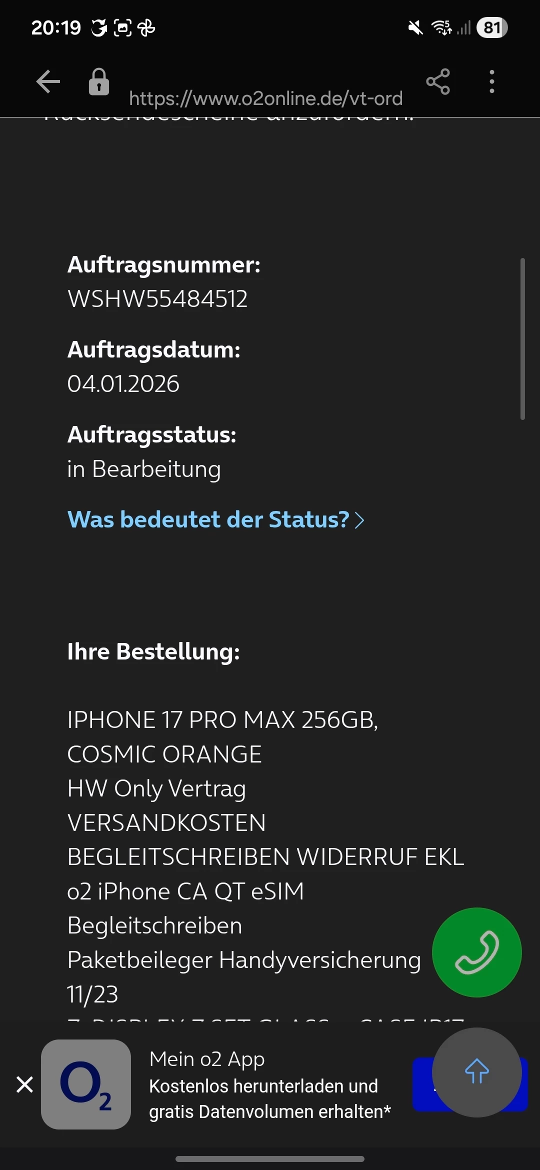 @GannLu moin ich warte selber seit dem 30.12.25 auf Dad iPhone 17pro Max in Orange und bei mir steht auch noch Vorbestellung . Gucke jeden Tag mehrfach rein habe schon zirka 5 mal O2 angerufen und jeder sagt was anderes. Bei der Bestellung hieß es (Sofort Lieferbar). Langsam werde ich auch ungeduldig nach fast 1nem Monat . Ich hasse warten 😂
