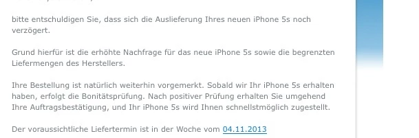 Grund hierfür ist die erhöhte Nachfrage für das neue iPhone 5s sowie die begrenzten Liefermengen des Herstellers.