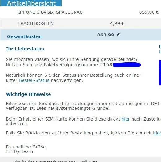 Was mich stutzig macht ist, dass ich nur eine Bestätigungsmail bekommen habe für die Bestellung und ich extra angerufen hab um eine Auftragsnummer zu bekommen.