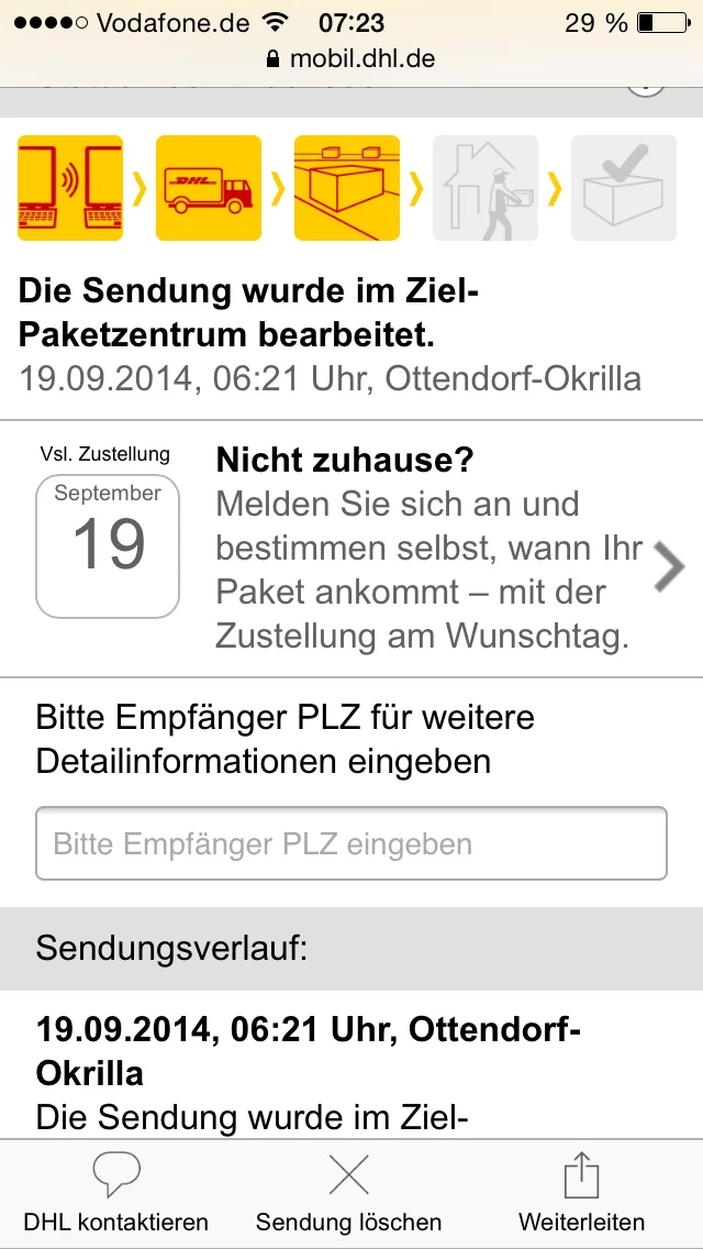 Vielleicht kommt unser iPhone trotzdem heute mit DHL und nur die Versand E-Mail wurde nicht verschickt weil sich unser Status noch auf "Vorbestellung" verhakt hat.