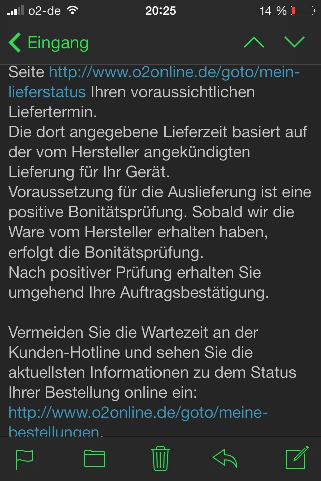 Normalerweise macht o2 ja die Bonitätsprüfung wenn die Ware auch wirklich zum versenden da ist. Vielleicht sind Sie ja diesmal von dieser Methode abgewichen.Wegen des großen Ansturms, das es logistisch nicht anders möglich war. Das heißt sie haben alle bestellten Geräte ins System eingegeben, unabhängig davon und Sie zur Verfügung stehen oder nicht. Und die Bonitätsprüfung machen Sie erst wenn die Geräte wirklich zum verschicken zur Verfügung stehen. Das würde die Sache mit Cayman erklären und der Grund warum manche immer noch auf Ihr Gerät warten, bzw warum es ewig auf Bearbeitung steht.