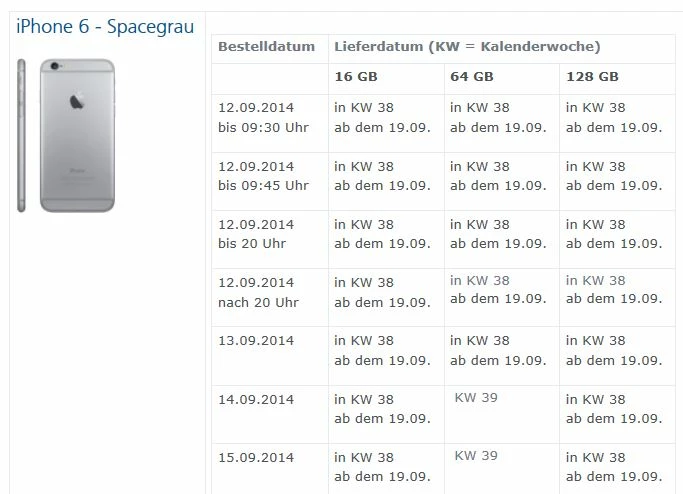 Laut der übersicht ist aber das Iphone 6 16 GB in Spacegrau bei bestellung am 13.09 in KW 38 lieferbar stimmt dann die übersicht von o2 nicht ?