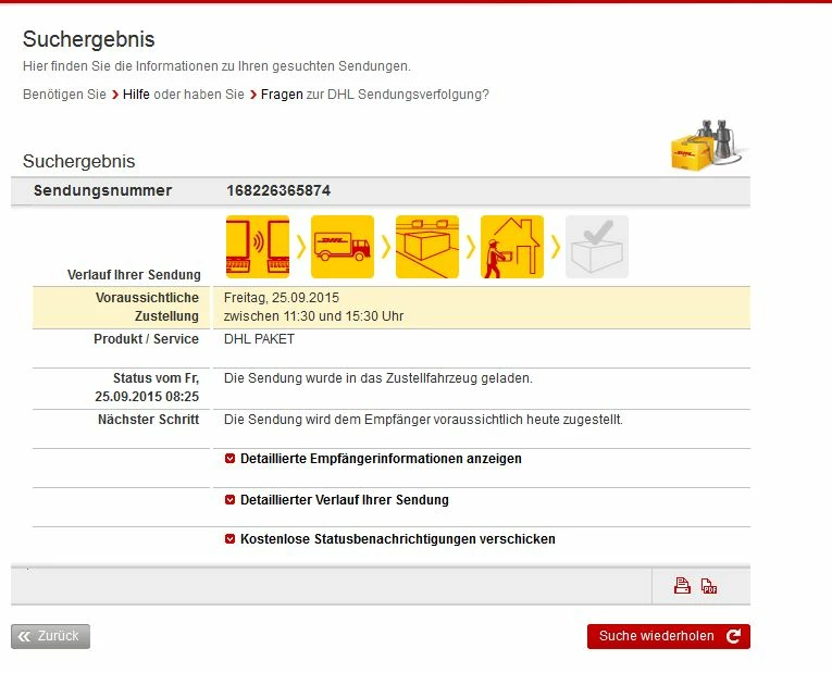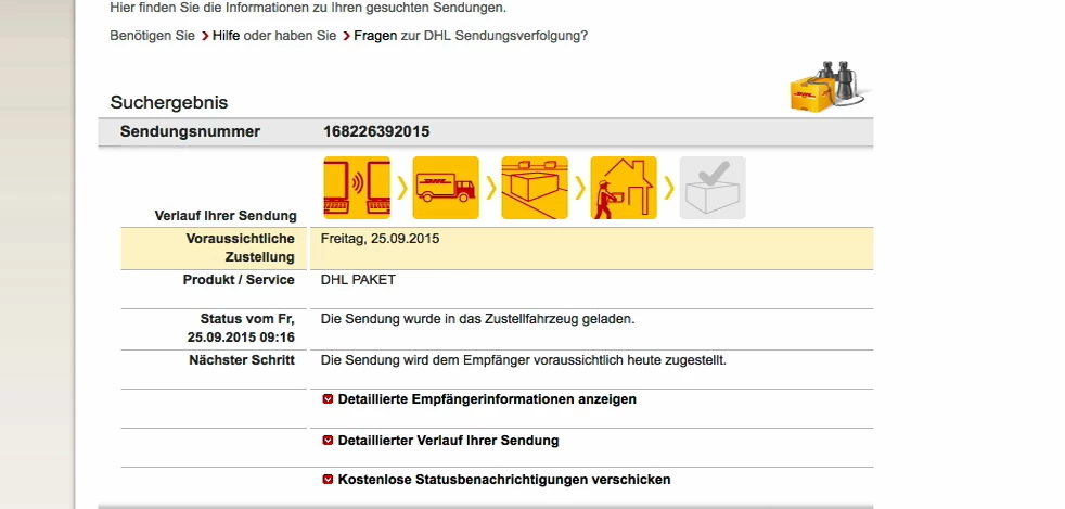 Mine030, bei mir steht auch nur "25.09.2015". Aber ich kenne DHL und weiss genau, dass sie bei mir immer zwischen 12 und 15 Uhr vorbei kommen.