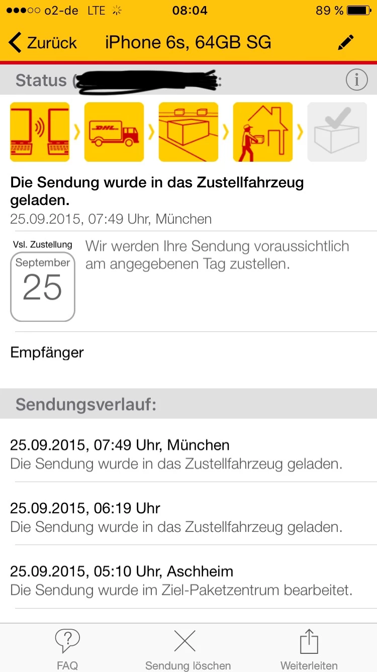 Eben hat die DHL Paketbotin bei mir geklingelt und das Baby abgegeben (iPhone 6S 64GB SG).