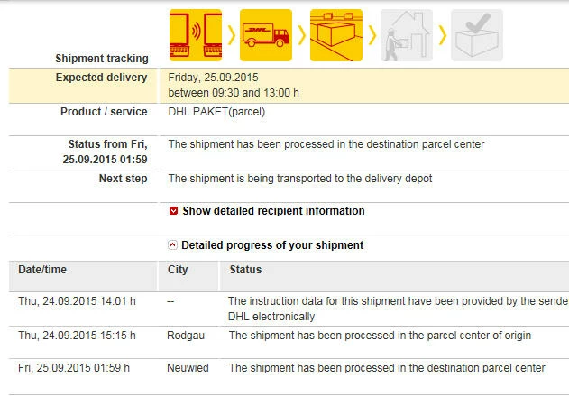 Status vom Fr, 25.09.2015 10:32  Die Sendung wurde in das Zustellfahrzeug geladen.
