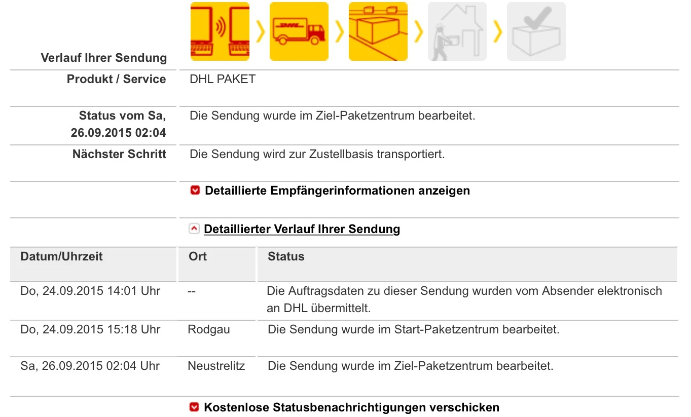 Mein letztes Paket wurde am 16.09. in das Zustellfahrzeug geladen. Danach änderte sich der Sendungsstatus 10 Tage lang nicht mehr. Ich rief geschlagene 10 mal bei DHL an und der Ansender des Paketes auch 2 mal. Und jedesmal wurde uns versprochen "morgen erfolgt die Zustellung". Doch passierte leider nichts.