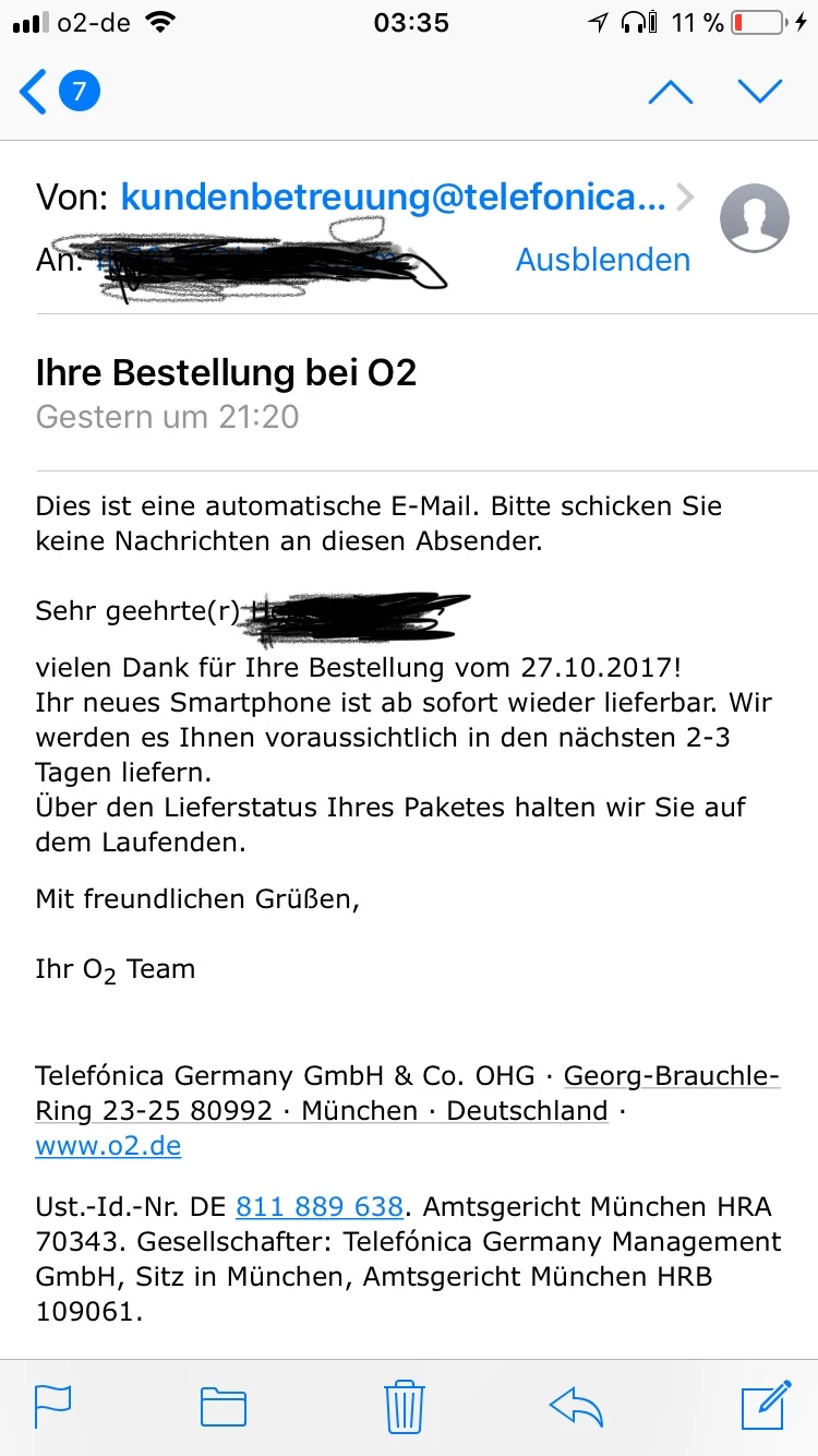 bestellt am 27. und erst gestern die Auftragsbestätigung erhalten. Ich hab gestern eine Email von o2 bekommen, dass meine Bestellung in Bearbeitung ist, aber in mein Bestellstatus steht es immer noch "Vorbestellung"..ich hoffe dass die Bestellung am Freitag trotzdem geliefert wird..