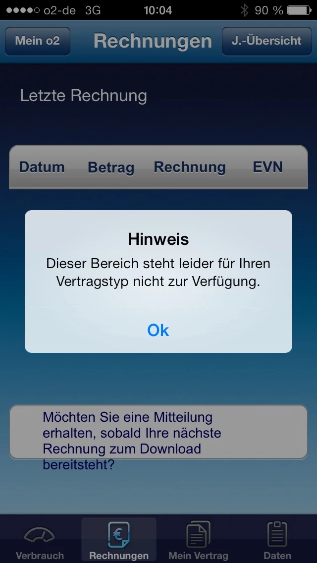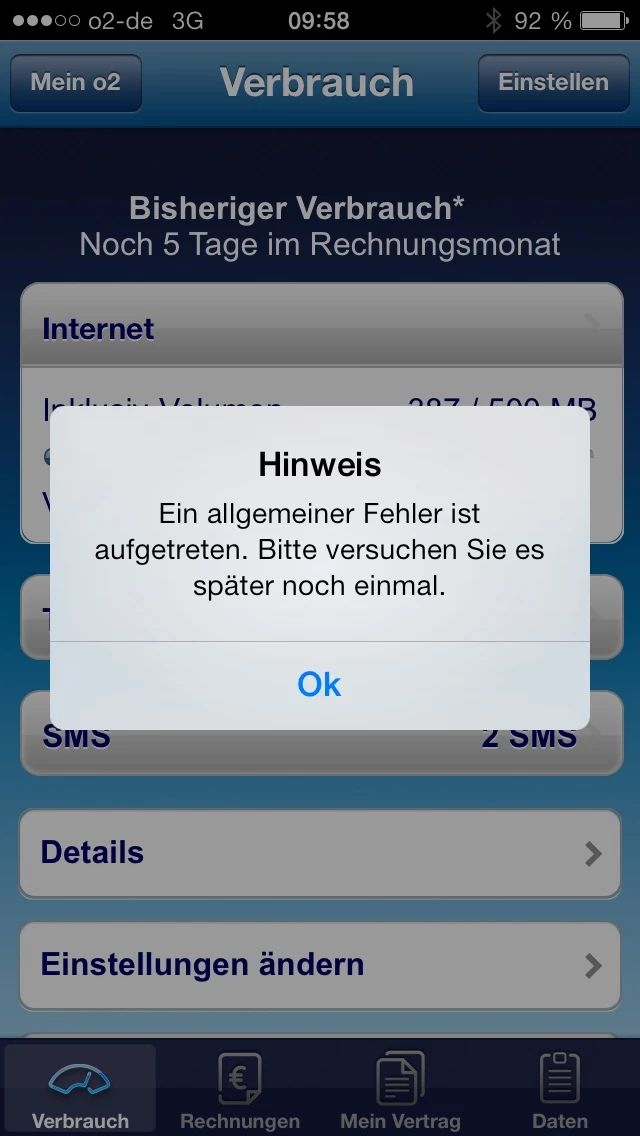 Sorry hat nicht geholfen. Ausgeloggt, geschlossen, geöffnet, eingeloggt, Fehlermeldung "Dieser Bereich steht leider für ihren Vertragstyp nicht zur Verfügung". Ok angetippt, App öffnet, Fehlermeldung "Es ist ein allgemeiner Fehler aufgetreten. Versuchen sie es später noch einmal". Ich nutze die App seit langem! Das passiert erst seit IOS 7!!