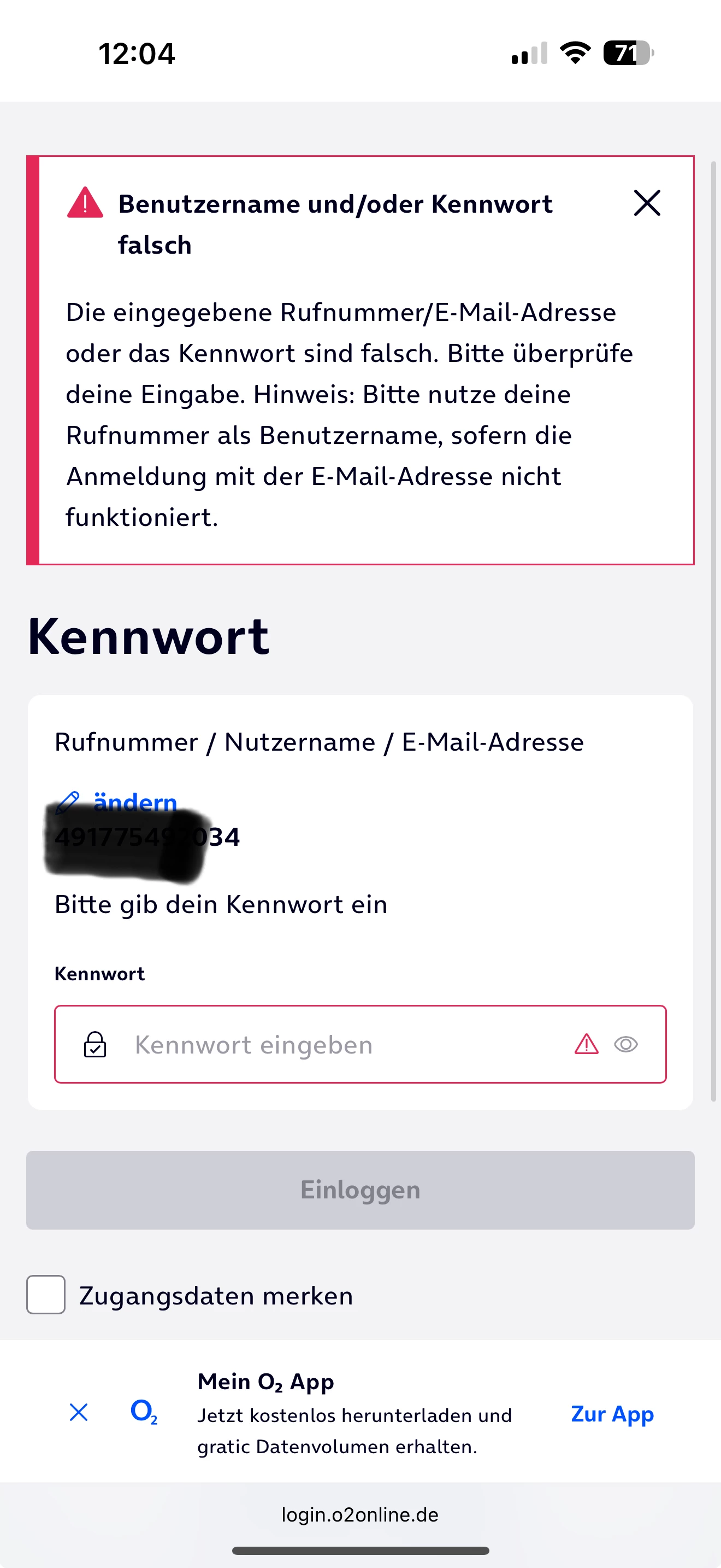 Du hast da offenbar ganz schön Durcheinander reingebracht. Gehe auf Passwort vergessen und probiere es dann nochmal. Außerdem logge dich mit der Rufnummer ein und nicht mit Email