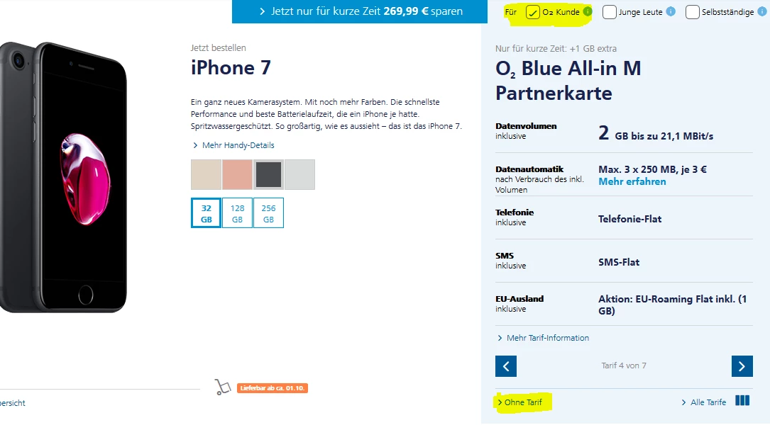 wenn du online bestellst, klickst du zuerst oben auf "o2 Kunde", daraufhin erscheint weiter unten die Option "Ohne Tarif" und du kannst das iPhone 7 bzw. 7 Plus ohne weiteren Tarif bestellen. ☺️