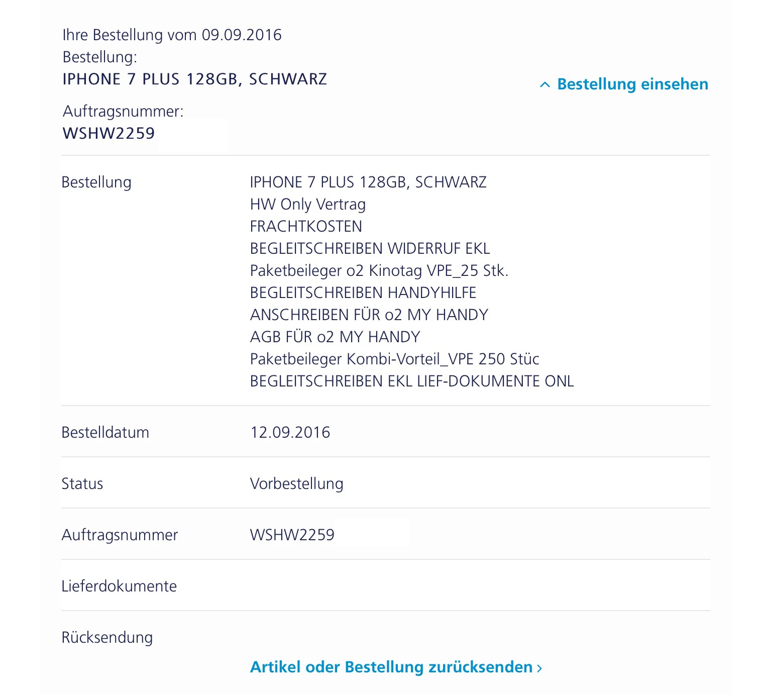 128 iPhone 7 Diamant schwarz , bestellt 09.09.2016 Auftragsbestätigung 12.09 bekommen .
