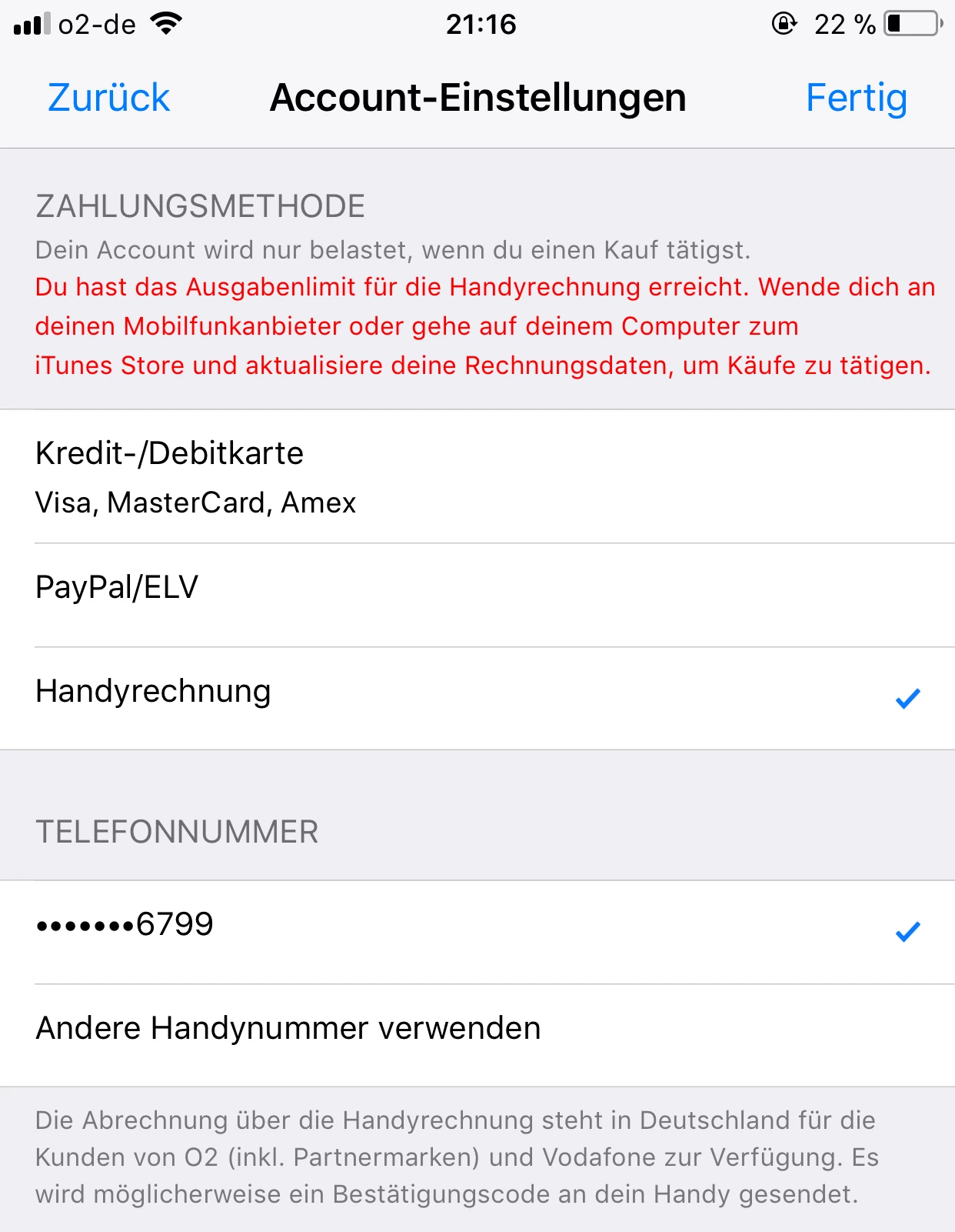 Ich versuchw nun schon seit Wochen bei meinem iPhone 6 in den Einstellungen die Zahlungsart Handyrechnung anzugeben, jedes Mal wird mir aber angezeigt „Deine Anfrage kann derzeit nicht abgeschlossen werden. Wende dich an deinen Mobilfunkanbieter“ kann mir bitte jemand helfen?