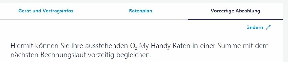 Unter Mein O2  -> My Handy Dort erscheint bei mir dann als dritter Reiter die vorzeitige Abzahlung