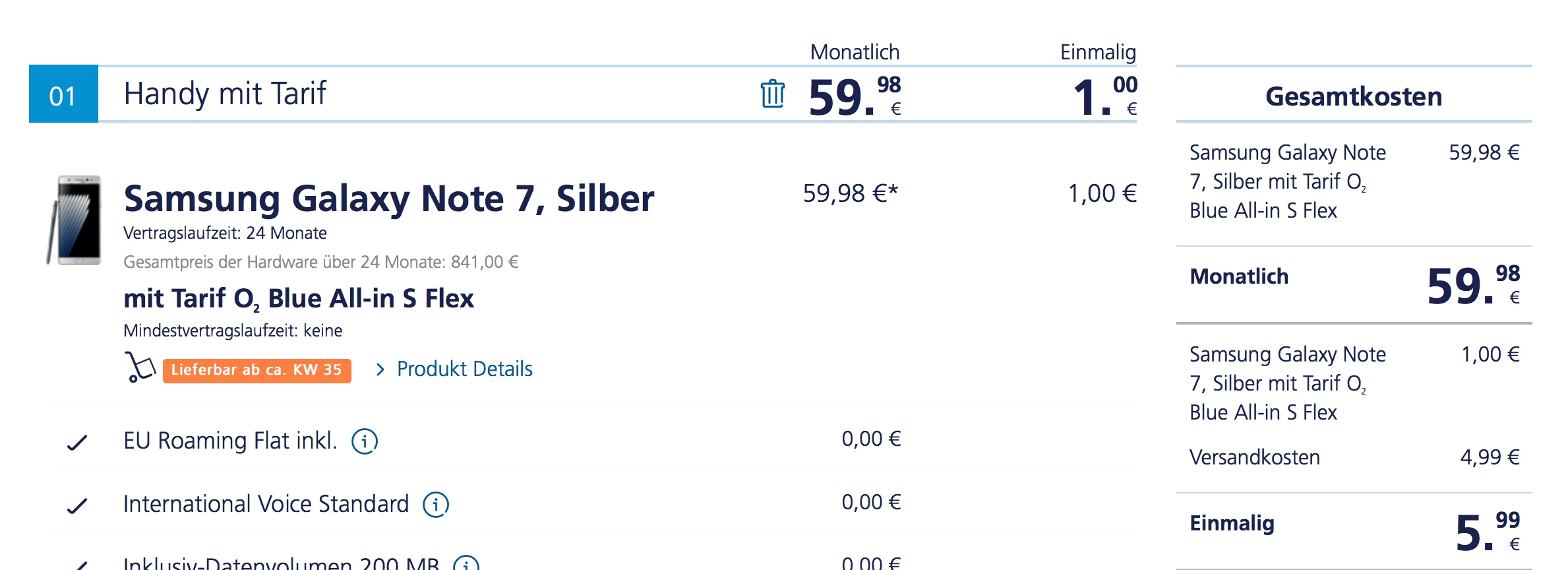Das mit dem Flextarif hatte mir ein Mitarbeiter im Chat empfohlen... er meinte zwar ich solle einfach einen Datentarif ohne Laufzeit nehmen und dann nach einem Monat kündigen, aber mit einem reinen Datentarif konnte ich das Note 7 auch noch nicht in den Warenkorb legen.