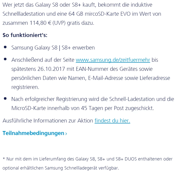 Hallo, habe heute das Galaxy S8+ aus einer Vertragsverlängerung bekommen. Nun verlangt die Seite "samsung.de/zeitfuermehr" nicht die EAN sondern die Rechnungsnummer nebst Rechnung. Nun frage ich mich, ob die Rechnung noch vor Ablauf der Frist kommt?