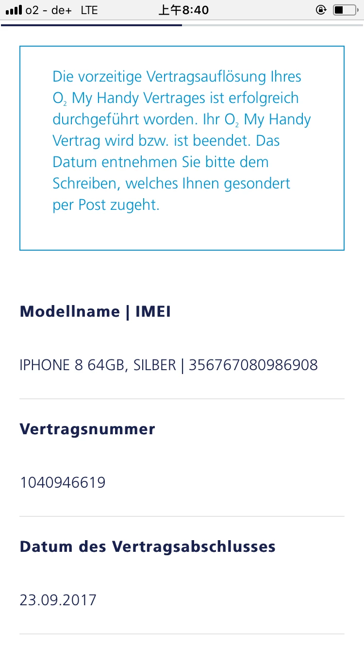 ich kann im Moment leider auch nicht sagen, warum eine Vertragsauflösung für den o2-my-Handy Vertrag in deinem Datensatz hinterlegt ist.