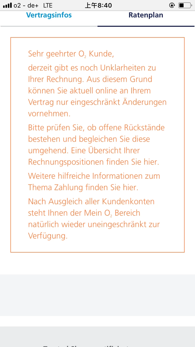 Ich habe in September die Vertragsverlängerung mit neu iPhone 8 zusammen gekauft. Bei normalen Weise soll ich 36/pro Monat bezahlen und in 19.10. erst mal bezahlen. Dann in 19.10 befinde ich,dass die Ratenzahlung aufgelöst wird! Aber ich weise