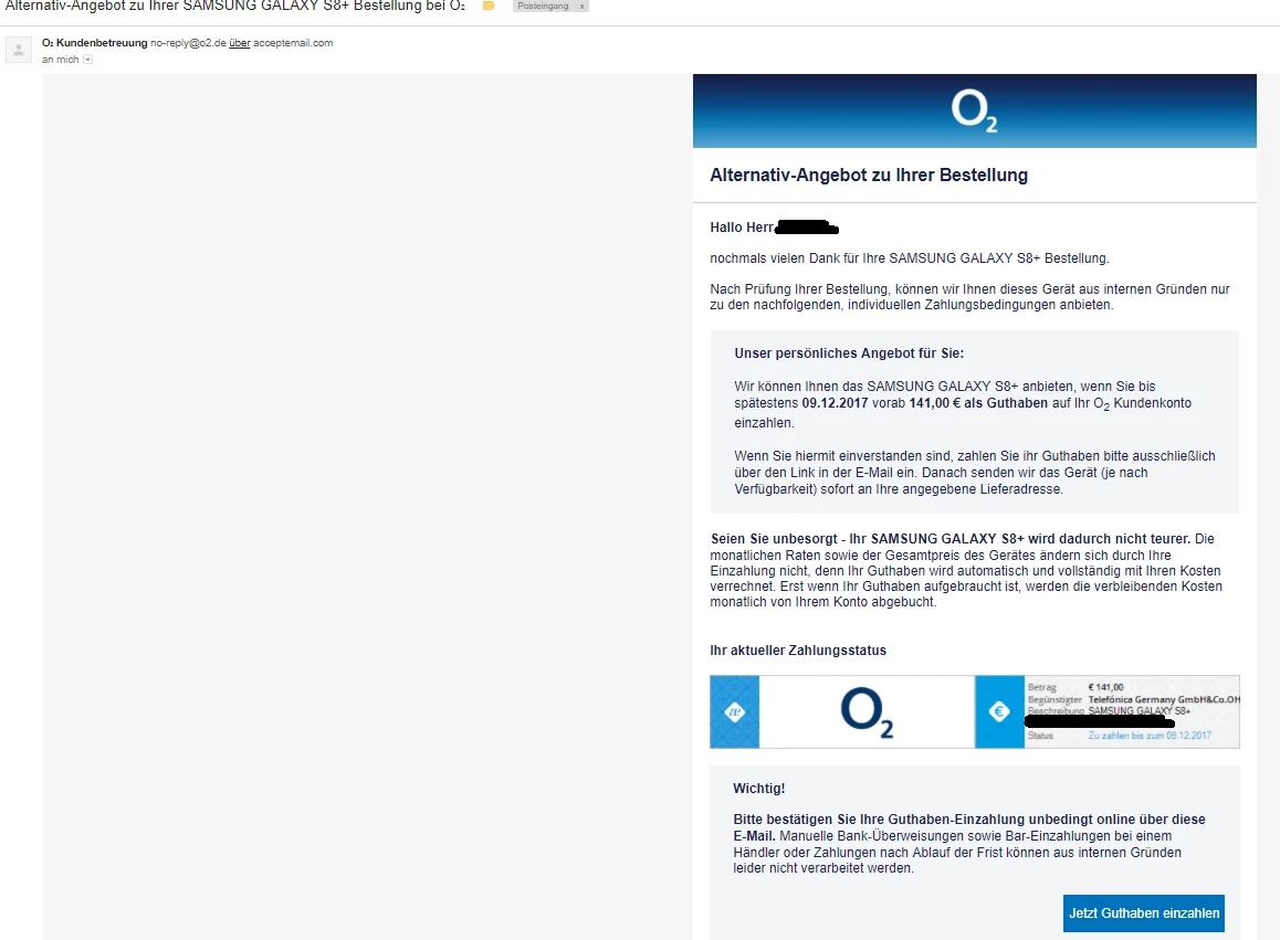 ich habe heute ein Smartphone, um genauer zu sein das Samsung Galaxy S8+ inkl. gratis GearFit 2 via 1€ Anzahlung und anschließender Ratenzahlung bestellt. Die Eingangsbestätigung habe ich auch wie gewohnt erhalten. Kurze Zeit später kam dann aber eine E-Mail von der O2-Kundenbetreuung, dass mir ein Alternativ-Angebot zu meiner Bestellung gemacht wird, da mir das S8+ aus internen Gründen nur unter dieser individuellen Zahlungsbedingungen angeboten werden kann. Im Anhang habe ich die E-Mail mal angehängt. Ich soll einen Betrag von 141 Euro als Guthaben via acceptemail auf mein O2-Kundenkonto bis zum 09.12.2017 einzahlen und erst wenn dieser Betrag eingezahlt wurde wird das S8+ an mich versendet. Da ich aber noch nie in irgendeiner Weise bei einem anderen Händler so seine Aufforderung erhalten habe, frage ich euch, ob diese E-Mail wirklich von O2 stammt und das so korrekt ist oder nicht? Ich bin mir sehr unsicher. Ich bin zudem bereits O2 DSL-Kunde. Wenn dies korrekt ist möchte ich dies jedoch nicht so tun. Muss ich den Betrag überweisen oder kann ich dieses "individuelle" Angebot dann einfach ignorieren?