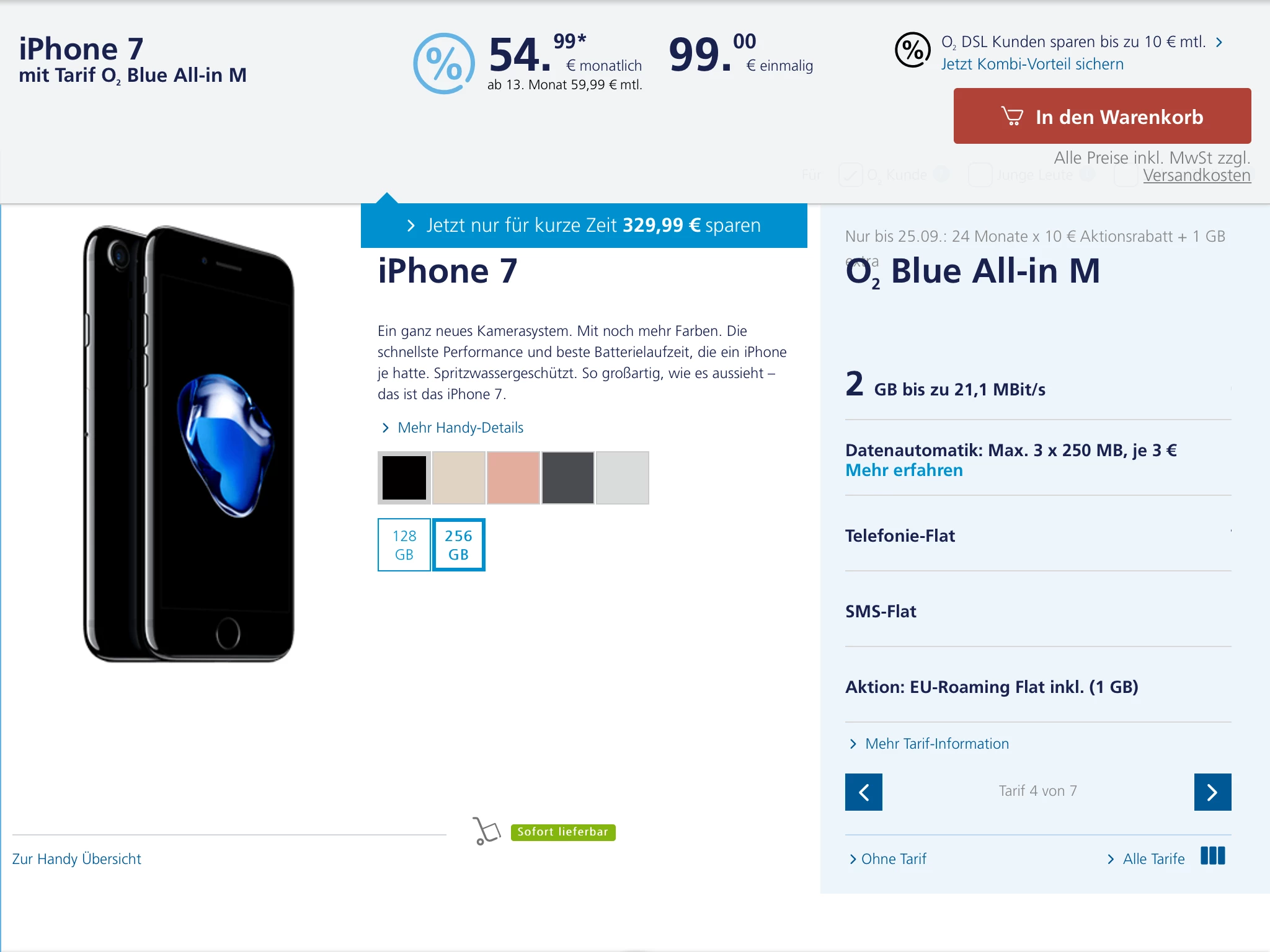 Ich habe am 9.9. das iPhone 7, diamantschwarz mit 128GB Vorbestellt. Im gleichen Zug meinen Vertrag verlängert.s