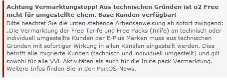 Für die zweitklassigen Eplus Kunden gibt es jetzt auch den O2 free Tarif nicht mehr, wegen technischer Probleme!