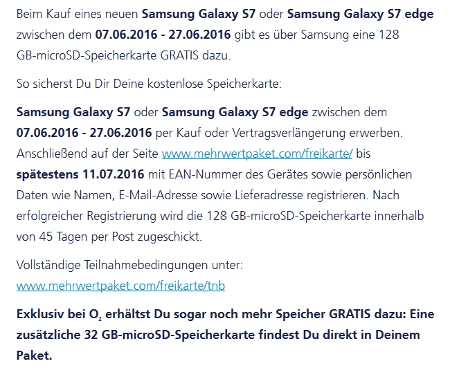 Hallo ich habe mir online das samsung galaxy s7 bestellt es kamm heute an aber die 32GB speicherkarte fehlt auf den lieferunterlagen steht es ist mit einer 32 GB speicherkarte dabei , habe auch o2 angerufen die meinten das ich mich an samsung wenden soll in der internet seite dan muss ich wohl meine imei geben und die senden mir es .