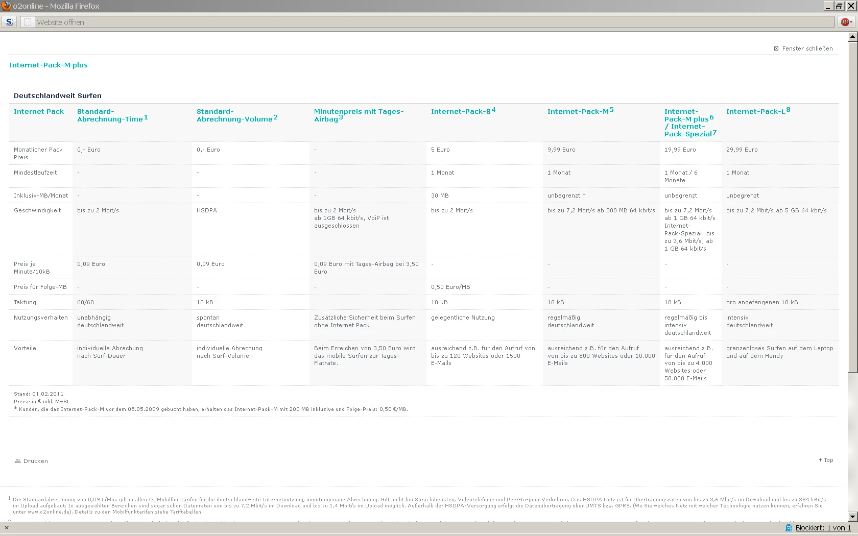 - Rechtliche Hinweise: "Gilt nur für paketvermittelte Datennutzung innerhalb Deutschlands einschließlich VoIP, nicht bei sonst. Sprach-, Videotelefoniediensten und Peer-to-peer Verkehren. Eine Weiterveräußerung, unentgeltliche Überlassung des Dienstes an Dritte und Nutzung zum Betrieb kommerzieller Dienste ist unzulässig. Bis zu einer Datennutzung von 5 GB pro Abrechnungsmonat steht eine maximale Geschwindigkeit von 7,2 Mbit/s zur Verfügung, danach bis zu 64 kBit/s. O2 behält sich vor, nach 24 Stunden jeweils eine automatische Trennung der Verbindung durchzuführen."