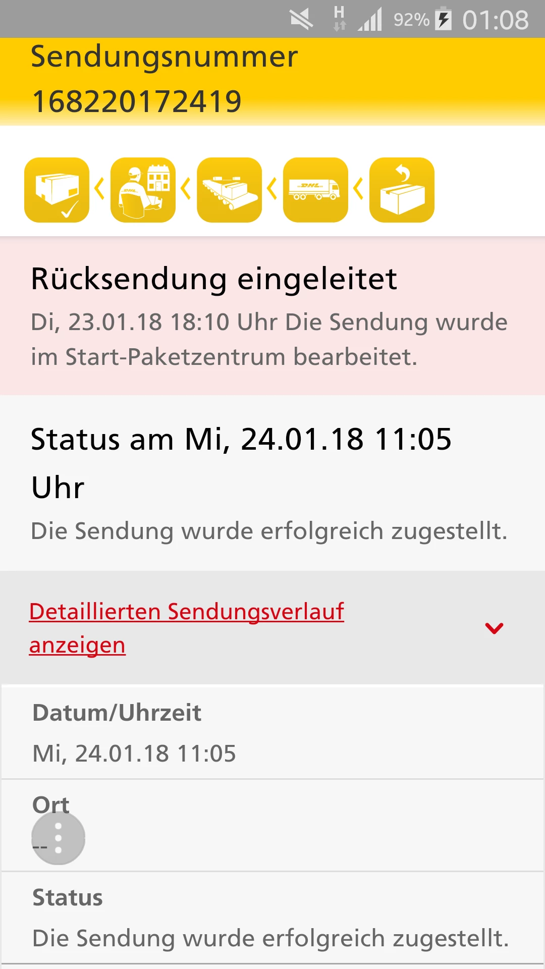 am 20.01 sollte das Handy bei dir sein, aber laut der Dokumentierung wurde dein Name nicht erkannt ("Der Empfänger ist nicht zu ermitteln (Name nicht auf Klingel/Briefkasten)").